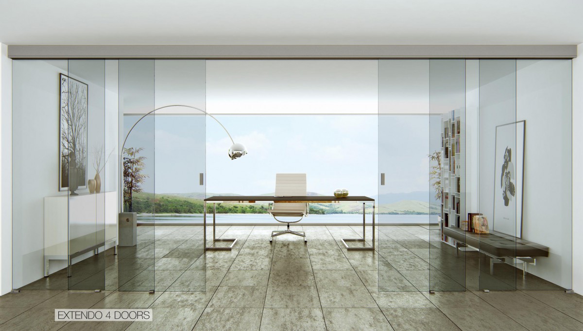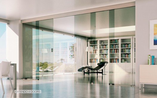 Sistema de puertas correderas telescópicas y sincronizadas de vidrio. Permite deslizar 2, 3 o 4 paneles sin marco para un frente acristalado sin igual. Moviendo una sola hoja, las demás se mueven al mismo tiempo para aparcarse en una zona reducida.