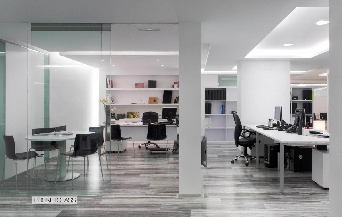 Diseñado para crear ambientes a través de uno o dos paneles enfrentados de vidrio sin marco generando más espacio y más luz de paso en las habitaciones correspondientes.